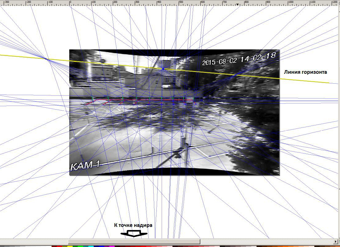 Метод перспективных построений заключается в определении положения объектов на местности по расположению их изображения относительно измерительной шкалы, построенной на изображении с учётом перспективы. Для того чтобы обеспечить базу перспективных построений, необходимо определить на изображении расположение основных элементов аппарата линейной перспективы, которыми являются предметная плоскость, линия горизонта, точка зенита/надира.